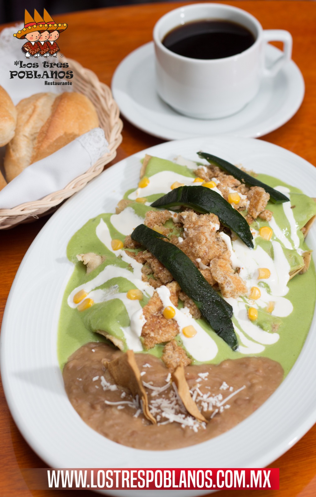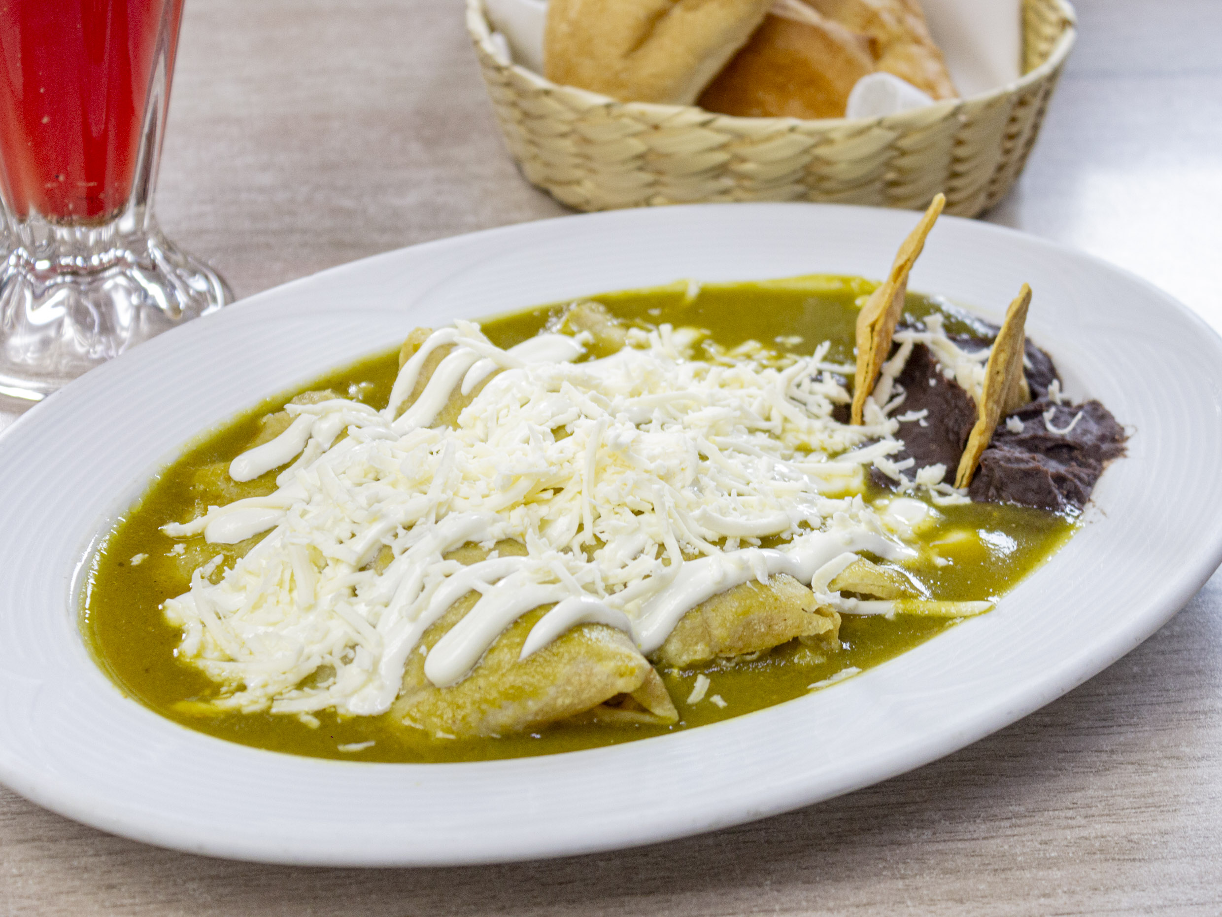 Tortillas de maíz rellenas de pollo o queso, bañadas con salsa verde o roja; acompañadas con frijoles refritos, crema y queso rallado.