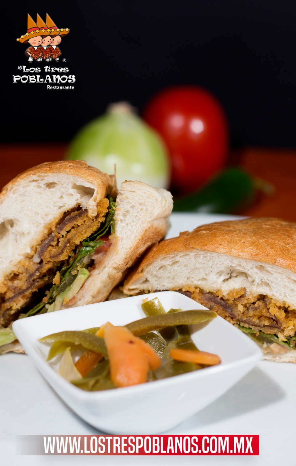 Carne de res empanizada y aderezada de mayonesa rellena con frijoles, lechuga, cebolla, aguacate, jitomate y picante.