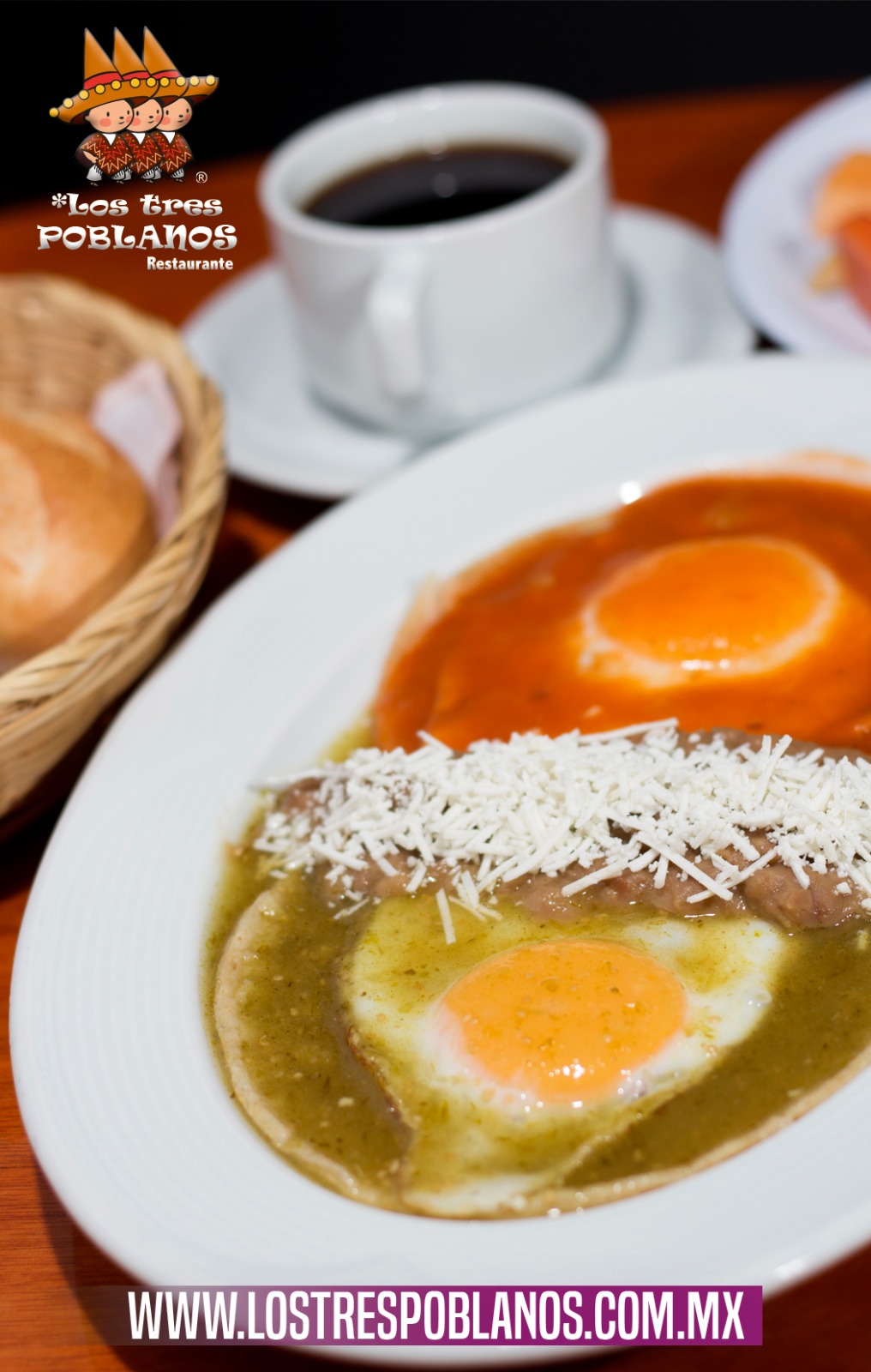 Tradicionales huevos estrellados bañados en salsa verde y roja; servidos sobre tortilla frita, dividida por frijoles refritos.