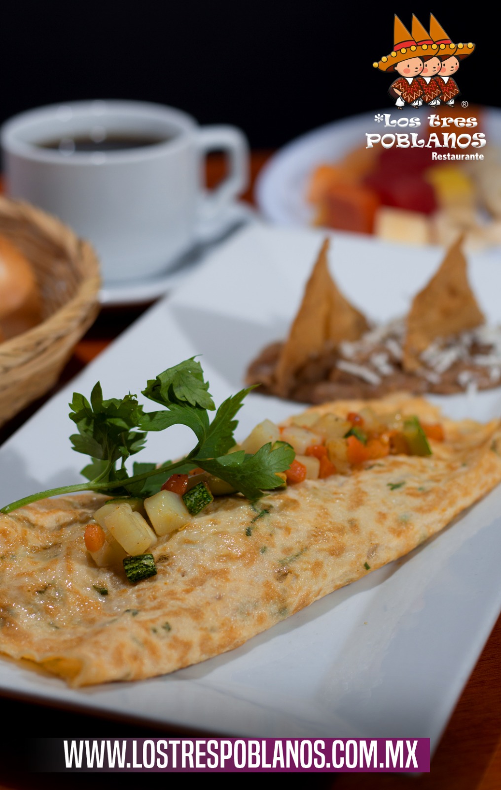 Tortilla de huevo revuelto con su exquisita preparación de champiñones y cebolla, acompañados de frijoles fritos.