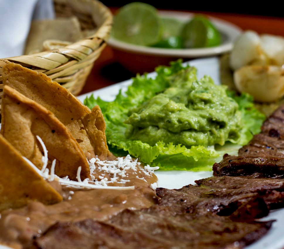 Totopos bañados con salsa verde o roja servidos con una sabrosa arrachera marinada; acompañada de crema, queso y guarnición de frijoles refritos.
