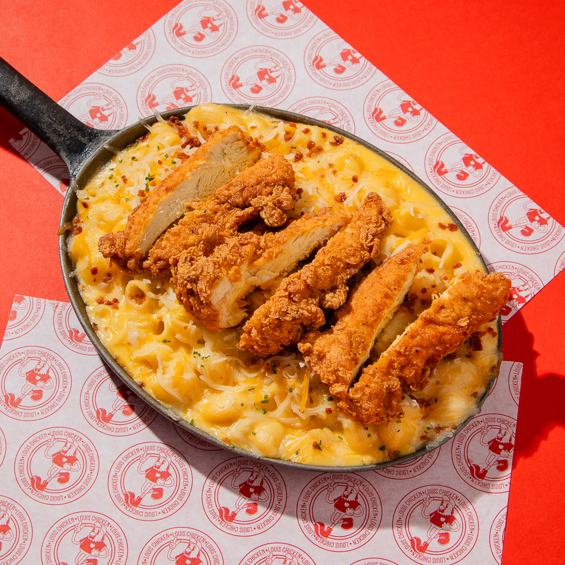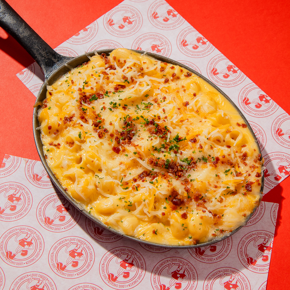 200gr de macarrones bañados en salsa de queso cheddar, crispy bacon y pollo frito