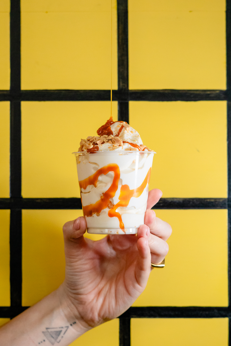 Helado de mantequilla bañado en caramelo salado y cacahuates tostados.