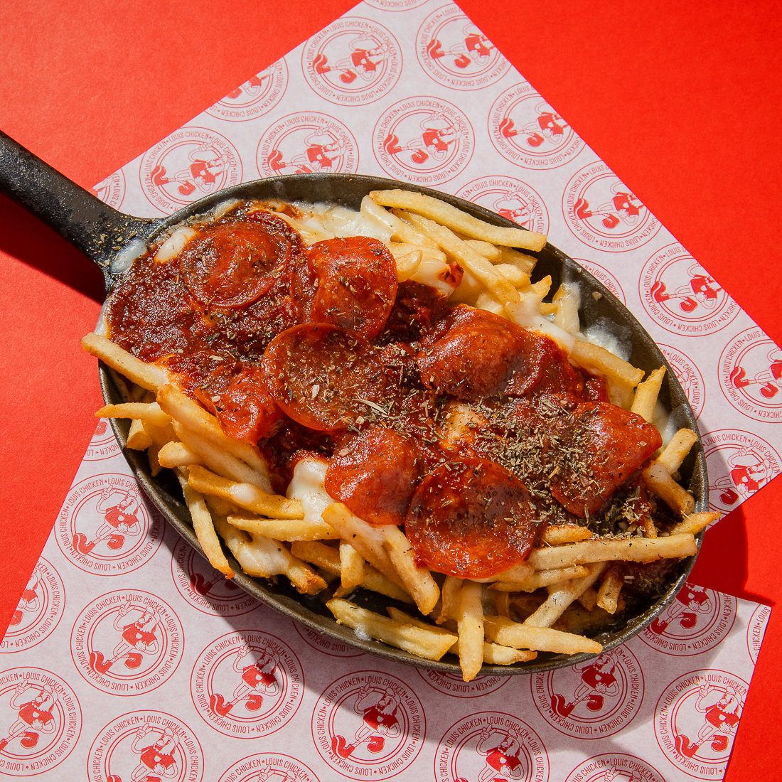 Papas fritas 400 gr bañadas en salsa arrabiata, queso mozzarella y pepperoni.