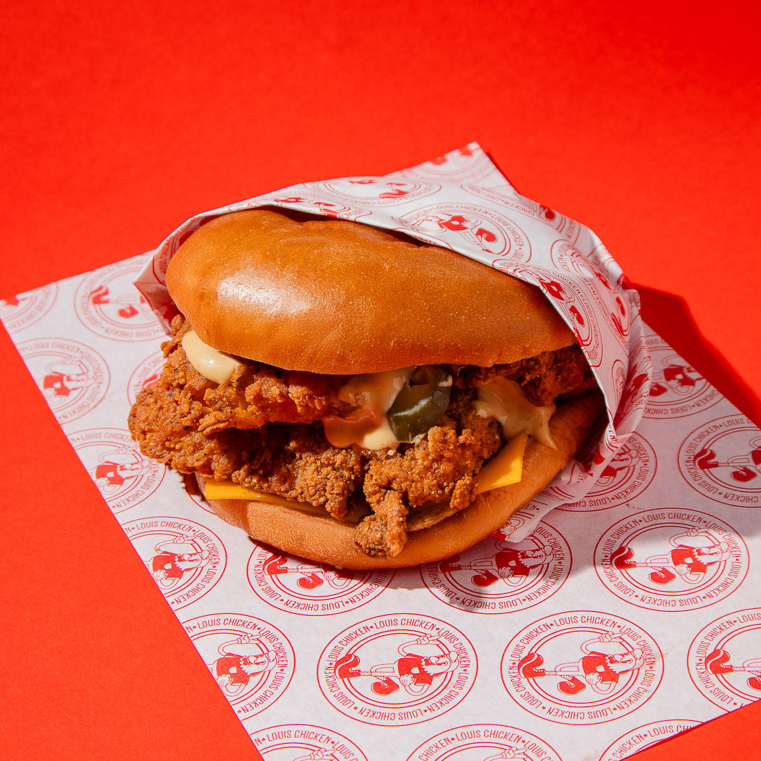 Hamburguesa de pechuga de pollo, queso americano, pepinillos encurtidos y aderezo ahumado