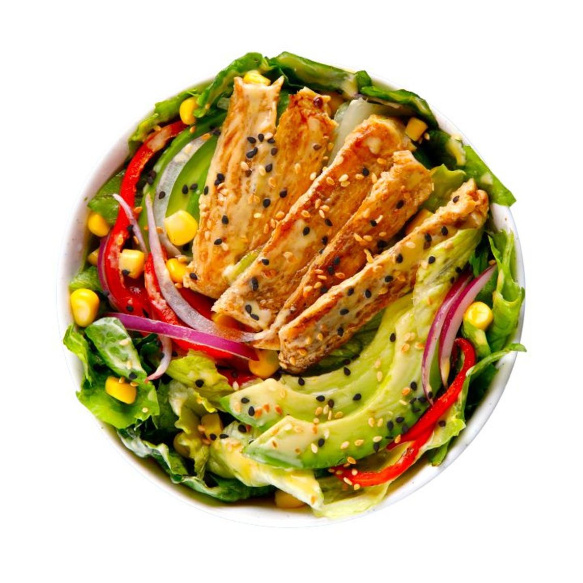 Pollo teriyaki (40 g), lechugas, pepino, pimiento rojo, cebolla morada, aguacate, elote y salsa mil islas.