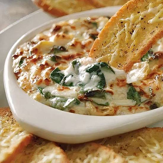 Fondue de camarón de 226 gr, espinaca y alcachofa con queso parmesano y mozzarella, y pan de ajo.