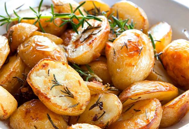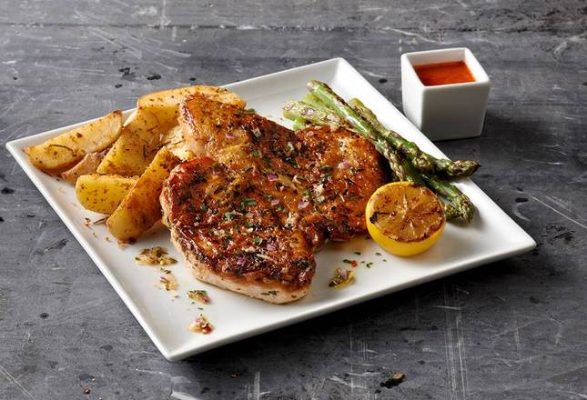 ½ Pollo horneado deshuesado de 450 gr con espárragos y florete de brócoli, papas al ajo y romero y salsa diávolo.