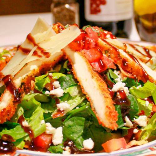 Ensalada de lechuga orejona y romana, tiras de pollo empanizado 56 gr, trocitos de tocino, queso feta, jitomate picado, láminas de queso grana padano, aderezo ranch y vinagreta balsámica con miel.