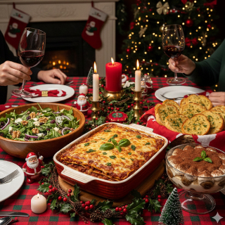 Lasagna Bolognese (1 kg), Insalata Blue, Tiramisú (750 g) y pan de ajo.