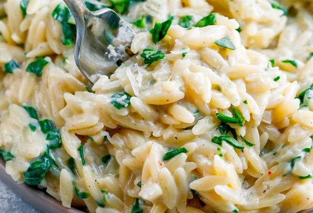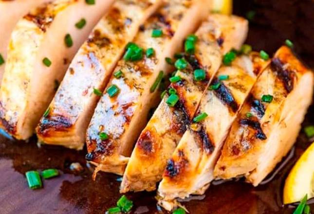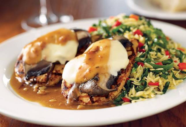 Pechuga de pollo de 198 gr a la parrilla, hongo portobello, gratinados en queso mozzarella, salsa de ajo rostizado y romero, con pasta orzo, espinaca y pimiento.