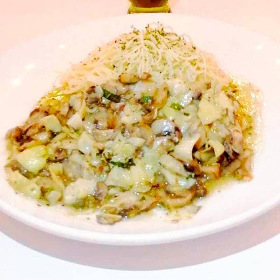 Filete de pescado de 226 gr con alcachofas, champiñones, alcaparras, salsa de ajo y aceite, servido con pasta capellini.
