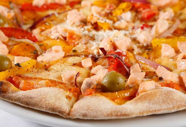 Pizza con salsa napolitana con quesos mozzarella y provolone ahumado, pimientos y cebolla morada rostizadas, 85 gramos en cubos de salmón, queso parmesano y aceitunas de 27 cm.