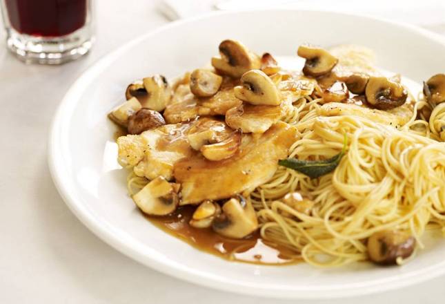 3 filetes de pollo de 170 gr con champiñones, ajo rostizado y salsa de vino marsala, con pasta capellini.