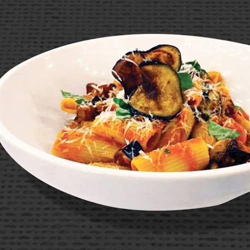Tradicional receta de la nonna; pasta en salsa pomodoro, berenjena frita y jitomate cherry; perfumada con albahaca, acompañada de una lluvia de queso.