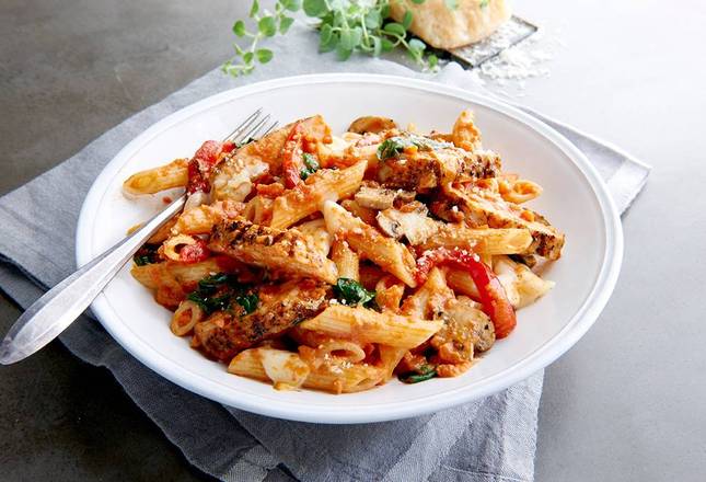 Pasta con 85 gr de pollo a la parrilla en juliana, cebolla caramelizada, champiñones mixtos y cremosa salsa de vino marsala.