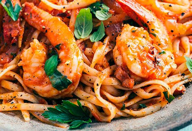 Pasta linguini, cuatro piezas de camarones en salsa arrabiata con albahaca y ajo.