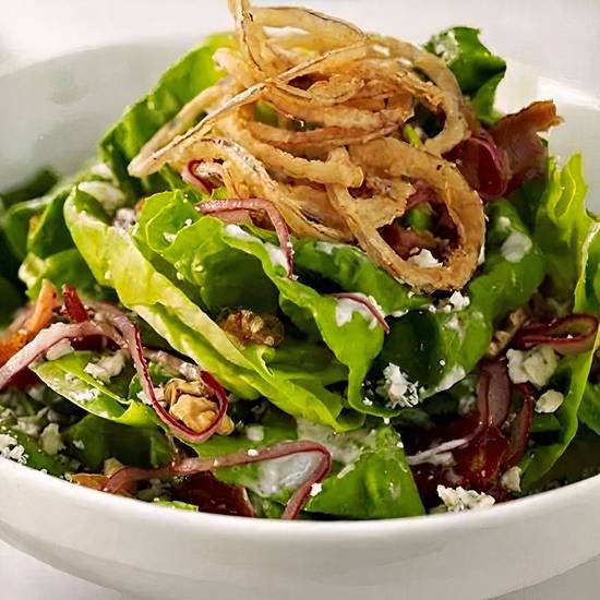 Ensalada de lechuga francesa acompañada de nueces, cebolla en escabeche y frita, pancetta, queso azul y aderezo ranch.