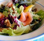 Refrescante ensalada con tocino, queso ,jitomate ,aguacate y pechuga rellena de jamón y queso