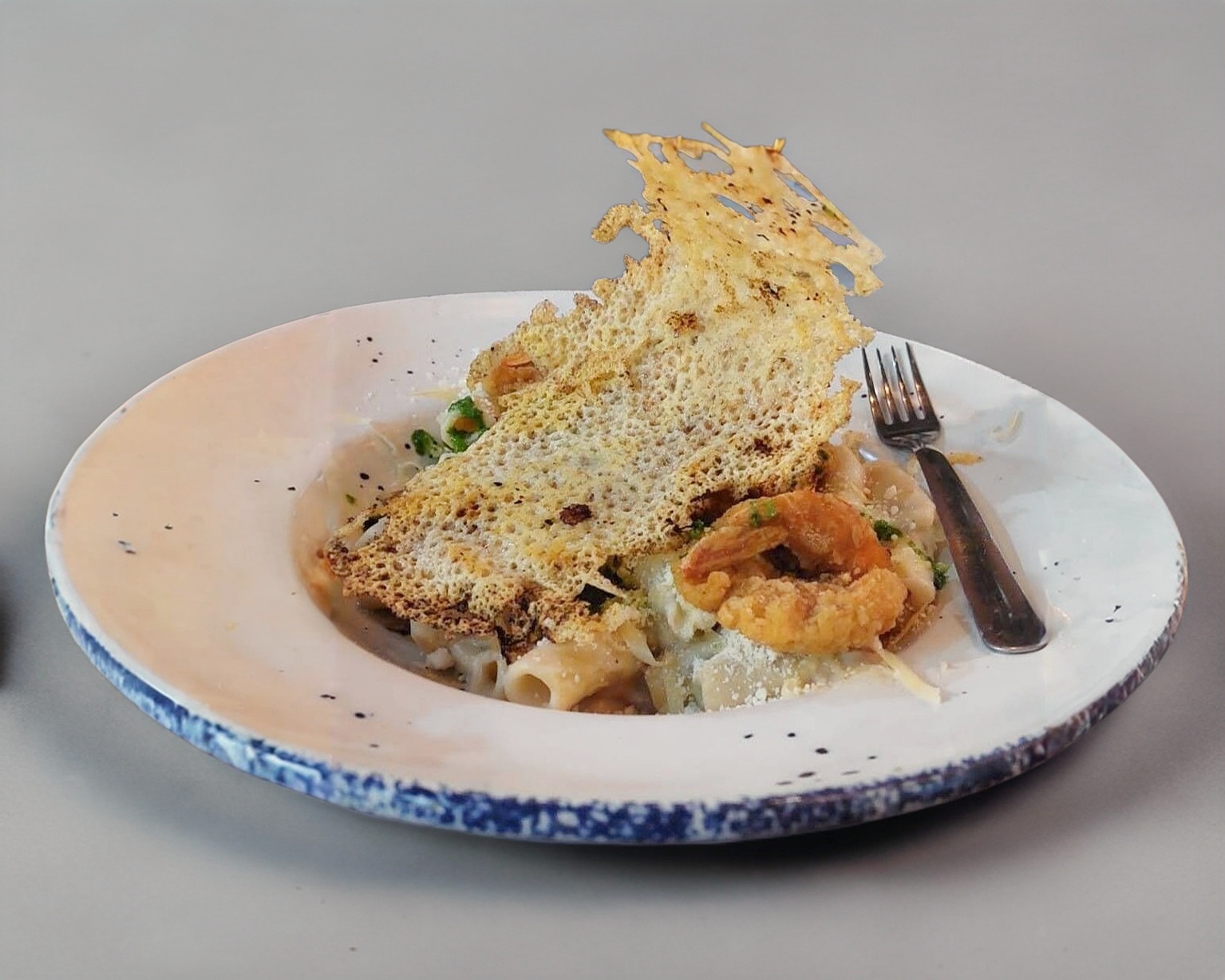 Deliciosa pasta con crema de queso , jamón , tocino y camarones empanizados