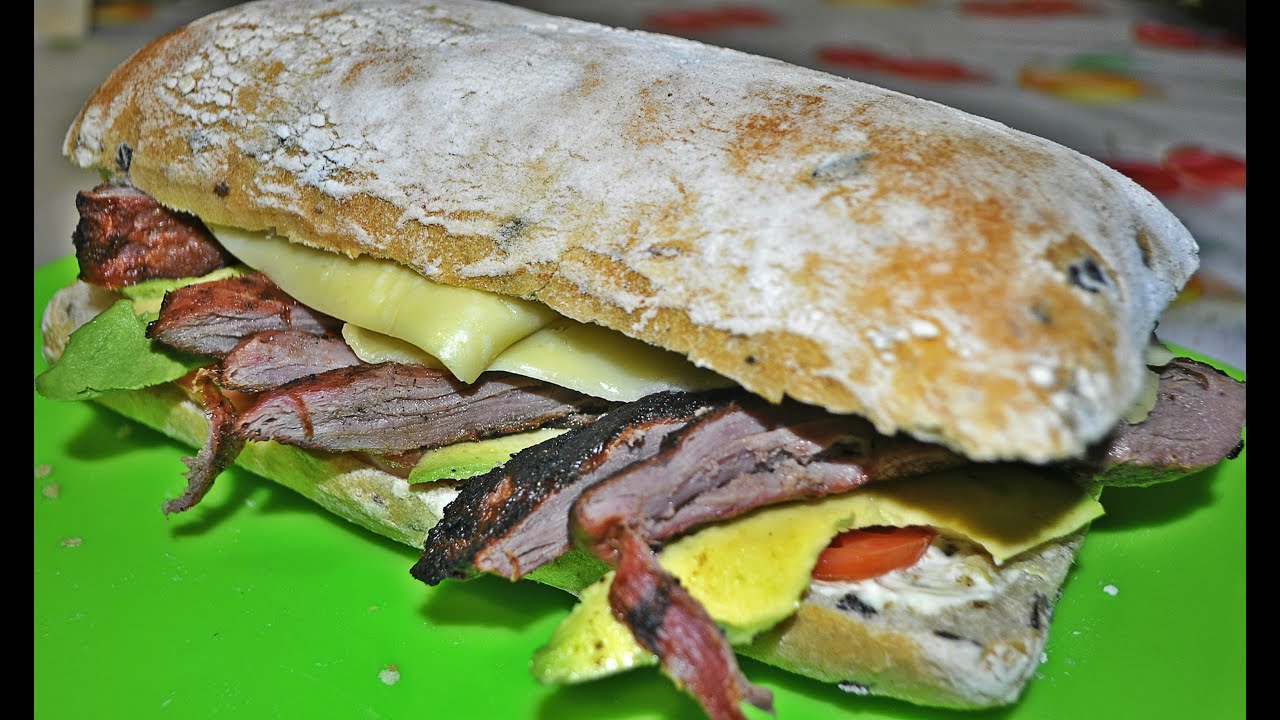 Pan crujiente de arrachera con pimientos , tocino y queso.