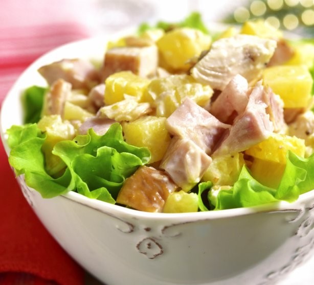 Refrescante ensalada con fresa, naranja ,piña y manzana con pechuga a la parmesana