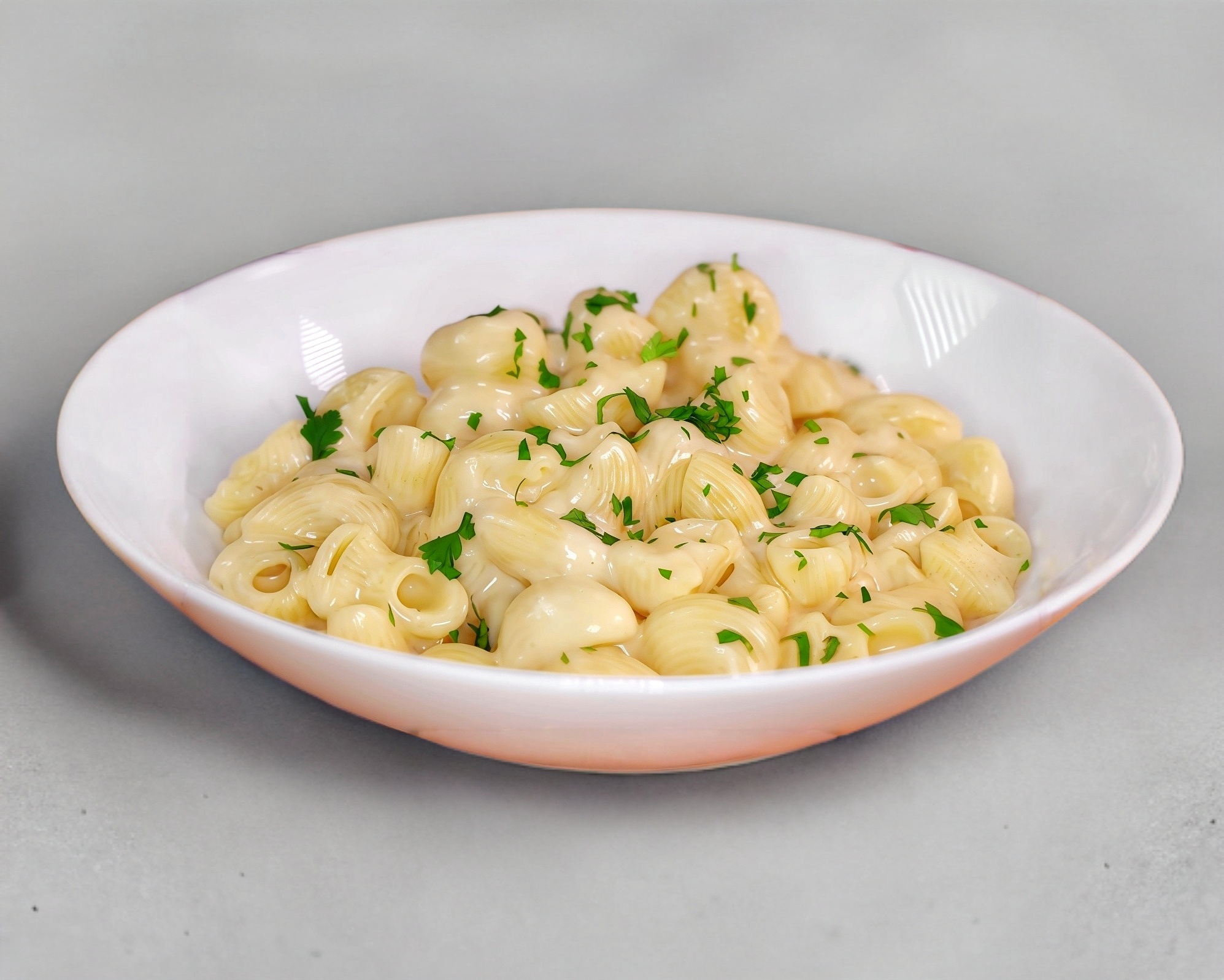 exquisita pasta con crema de queso cheddar tocino y bolitas de pollo frito