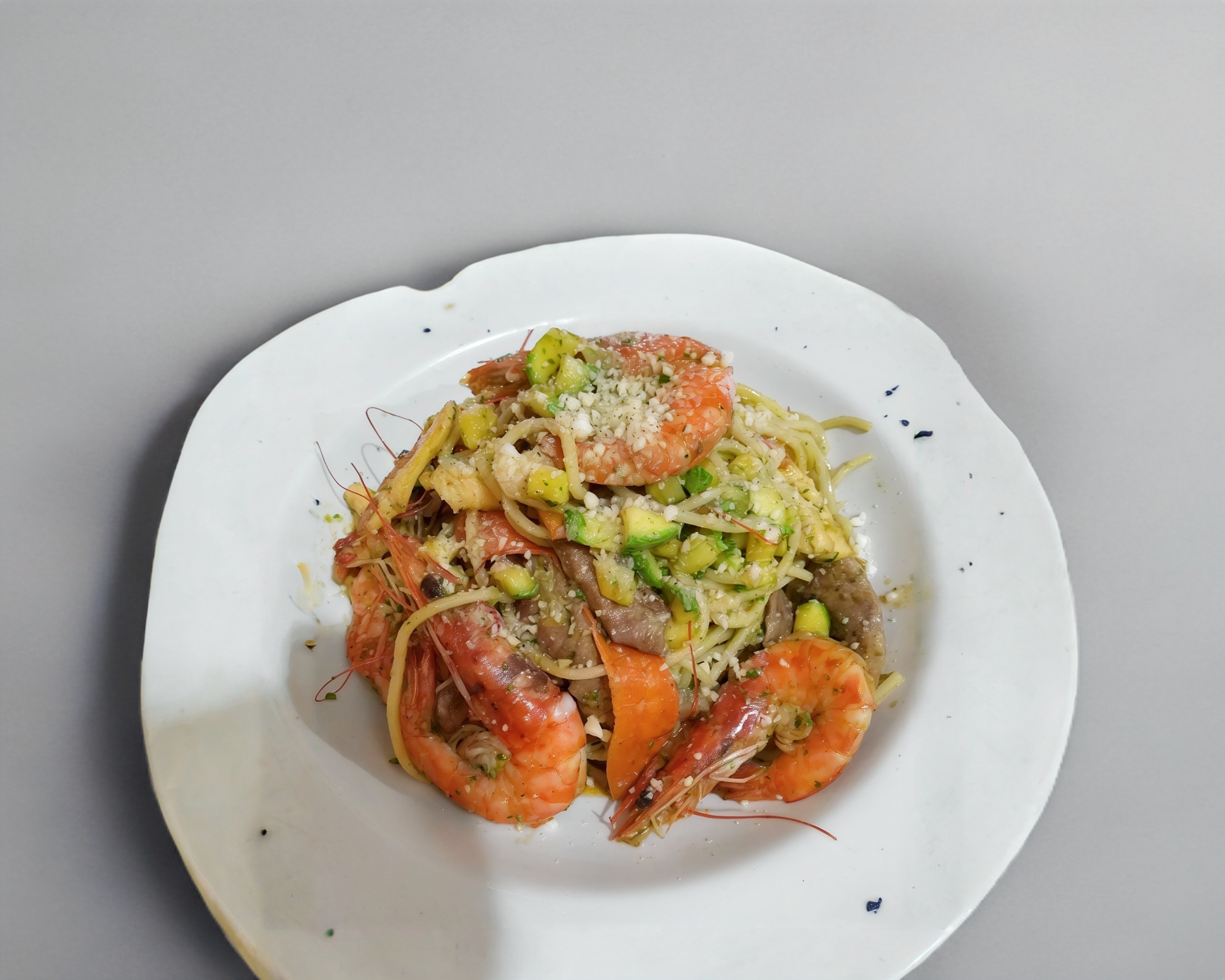 Deliciosa pasta con camaron pollo y res es salsa de perejil ligeramente picante