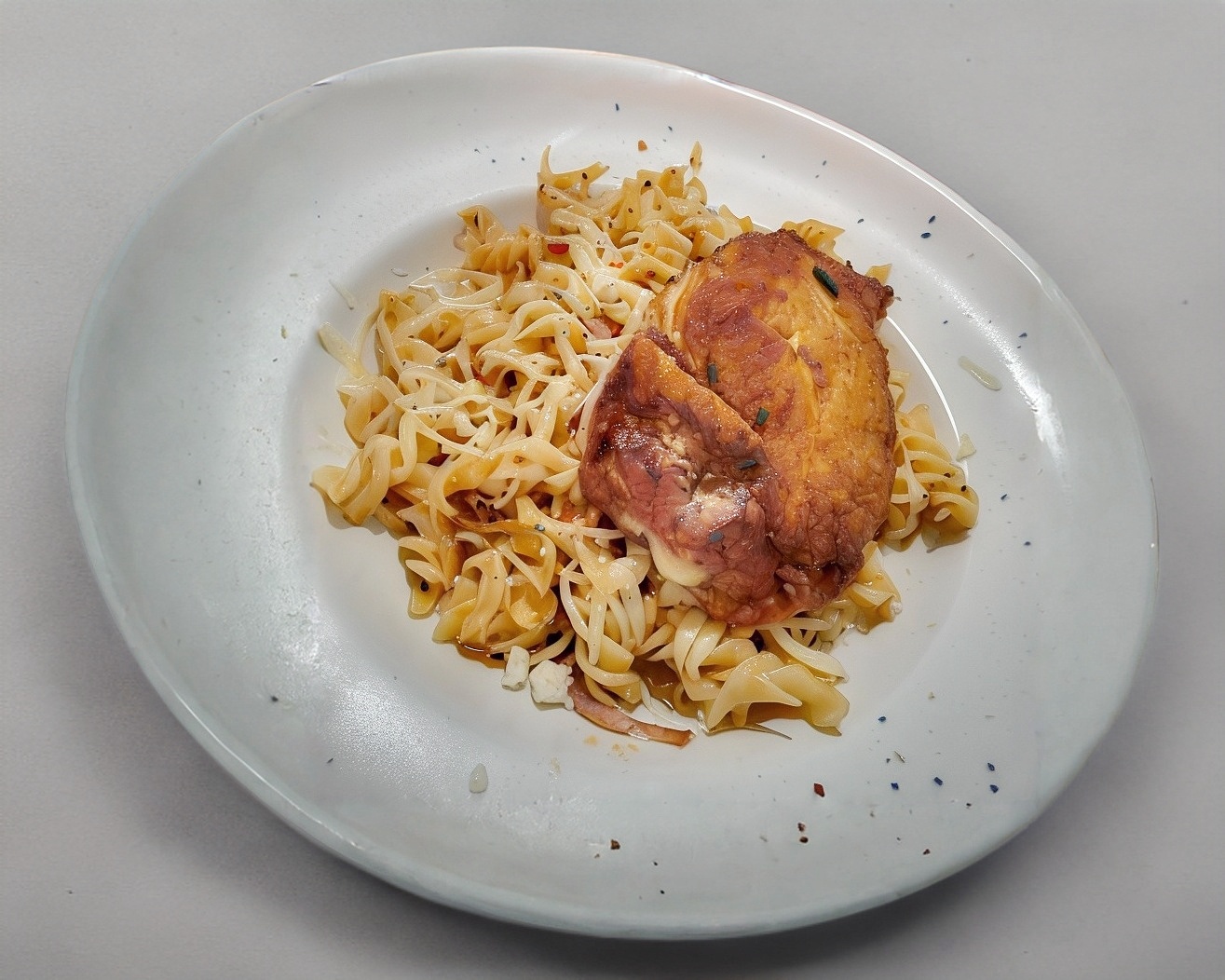 Deliciosa pasta con hojela de chile y tocino ,acompañada de pechuga rellena de jamon y queso