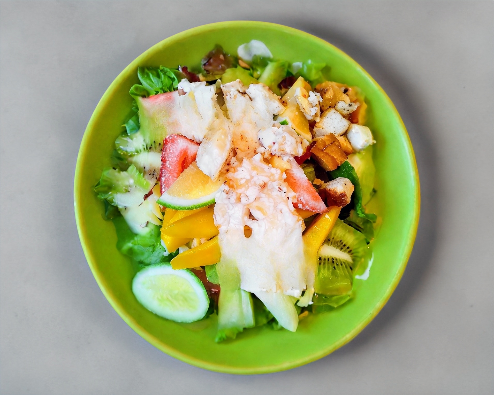 Ensalada con jicama , pepino arandanos piña , fresa y naranja con filete de polloo