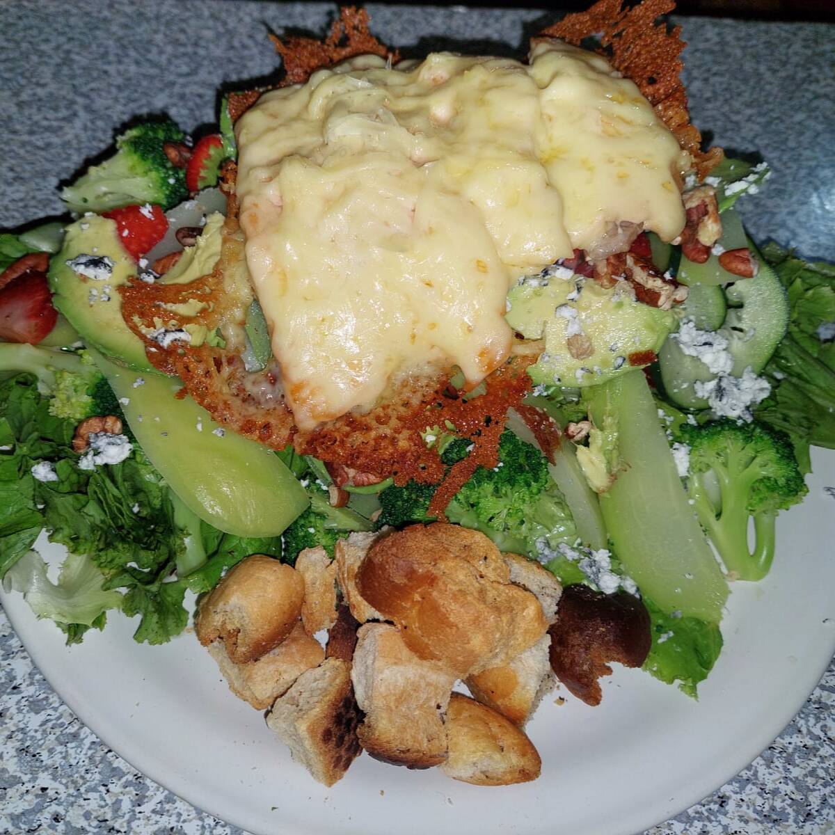 Ensalada con vegetales verdes con fresas, nueces y pollo gratinado