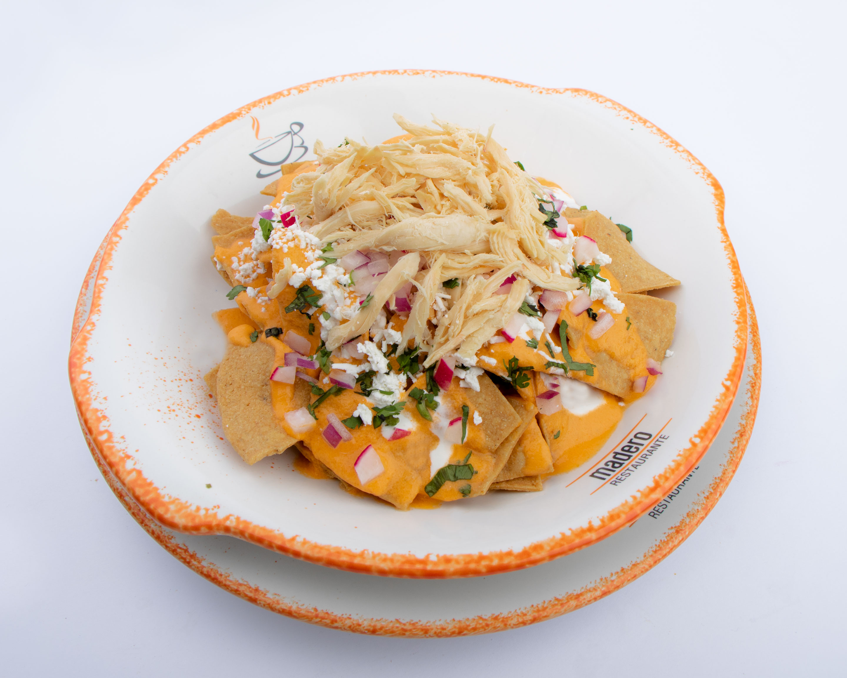 Totopos de maíz fritos, bañados con salsa suiza verde, con 60 g de pechuga deshebrada, queso canasto, crema, cebolla morada, rábano y cilantro.