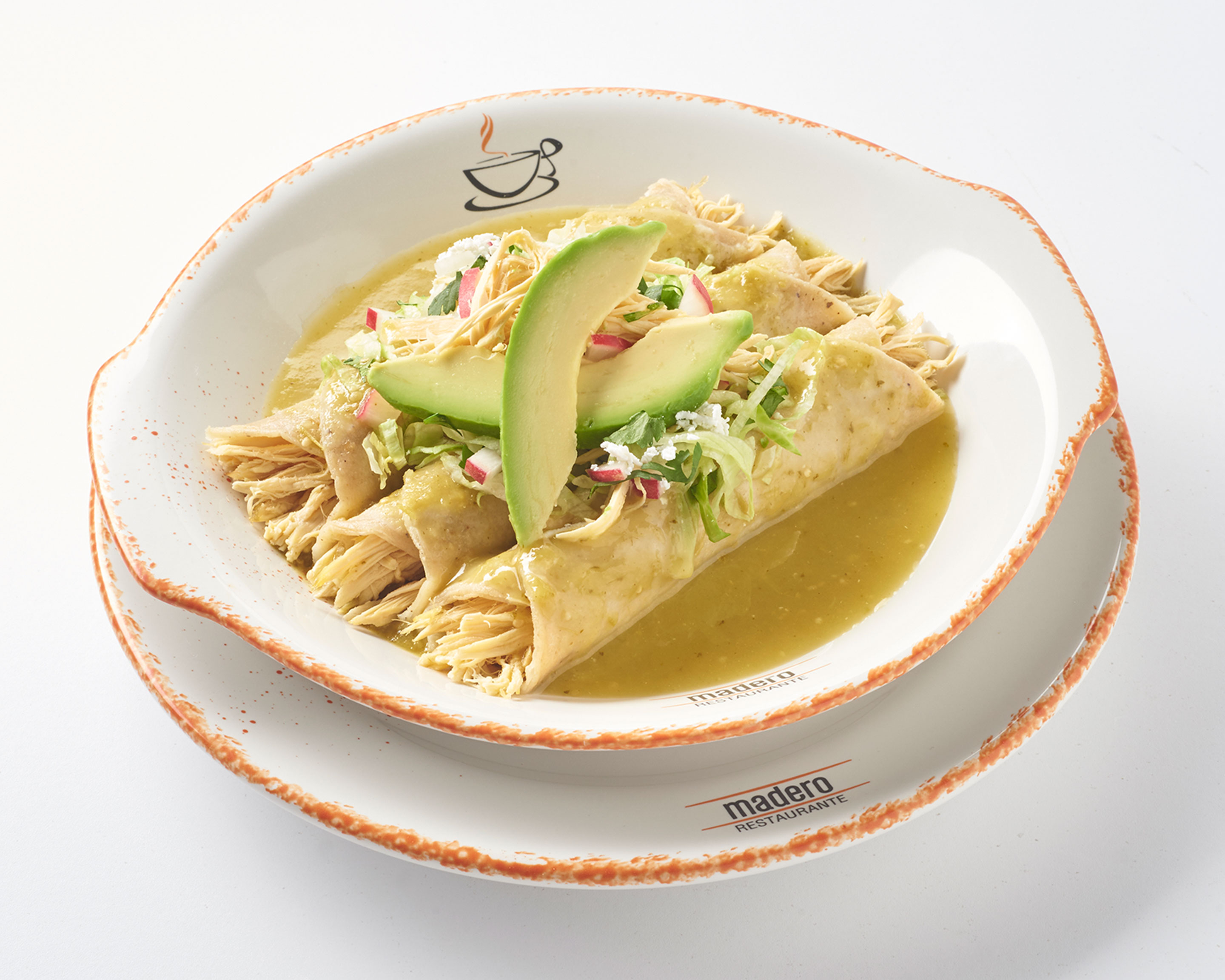 3 Enchiladas con pechuga de pollo deshebrada, bañadas con salsa hidalguense, lechuga, queso canasto, rábano, cilantro y aguacate.