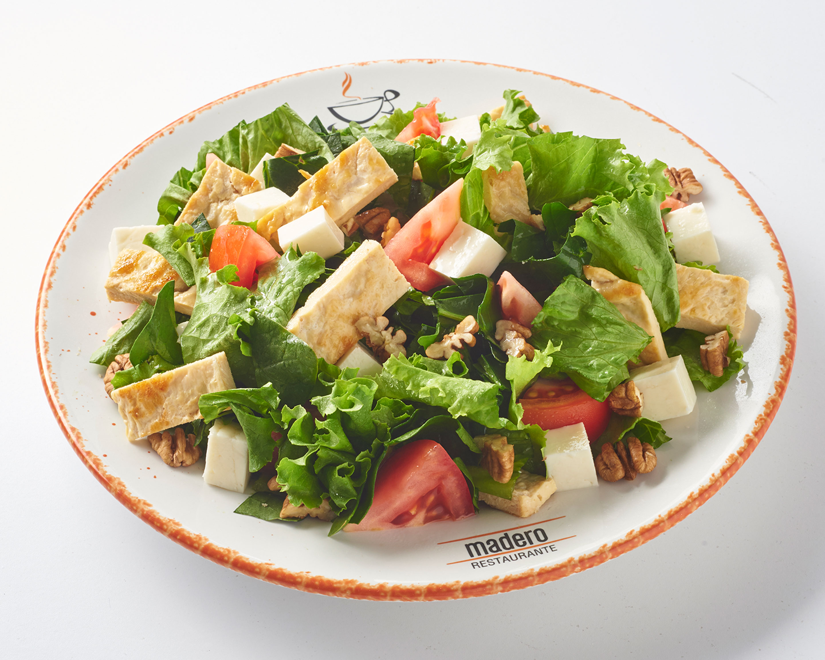 Ensalada lechuga italiana, espinaca, jitomate, nuez, queso panela, tiras pechuga de pollo, acompañada con aderezo a elegir.