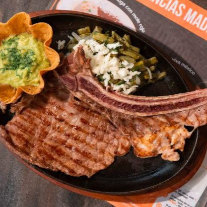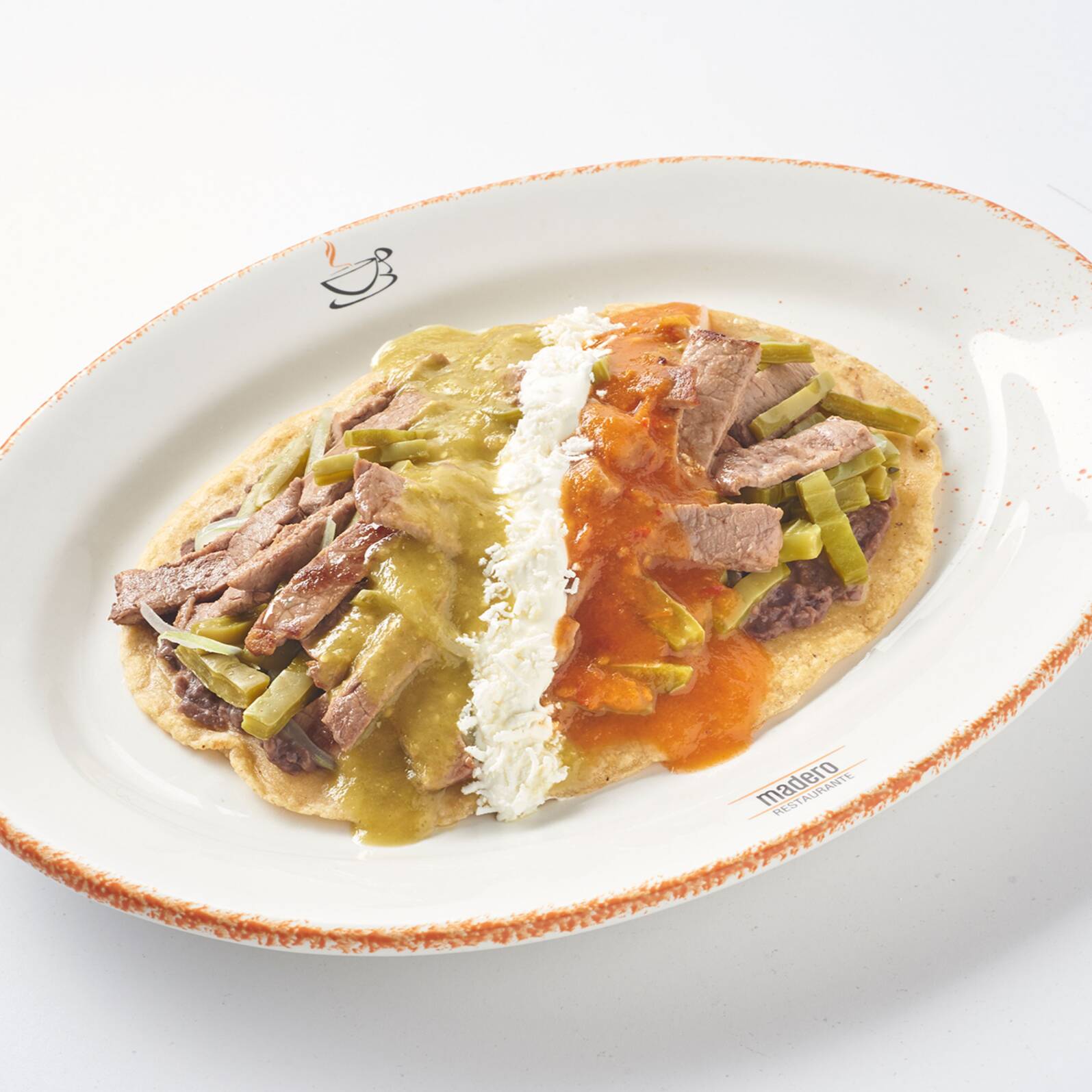 Huarache de maíz con frijoles refritos, 100 gr de tiras de bistec de res, nopales con cebolla, salsa verde, salsa de chile de árbol, crema y queso canasto.