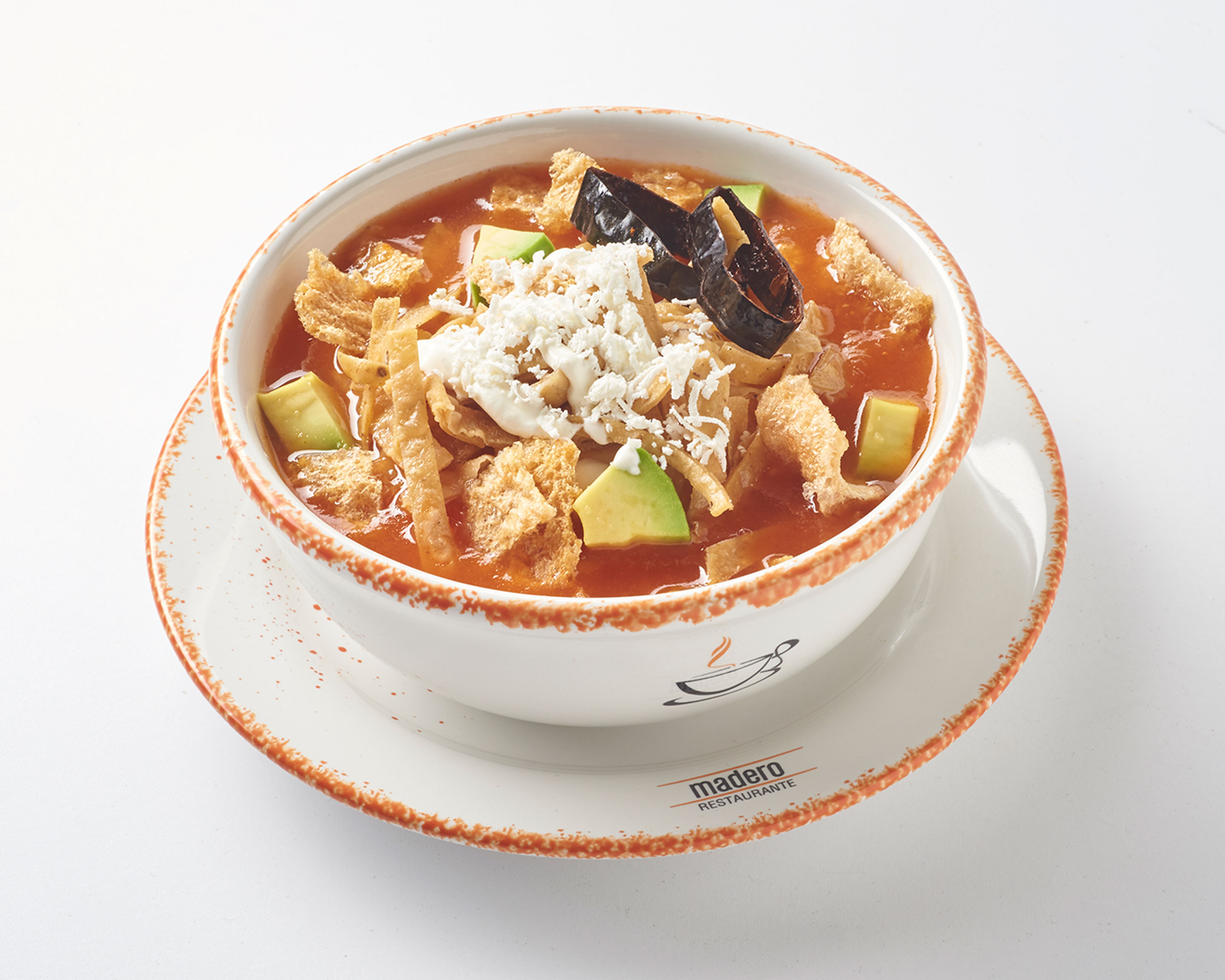 Caldo de jitomate con julianas de maíz fritas, crema, queso canasto, chicharrón de cerdo, aguacate y chile guajillo 240 ml.