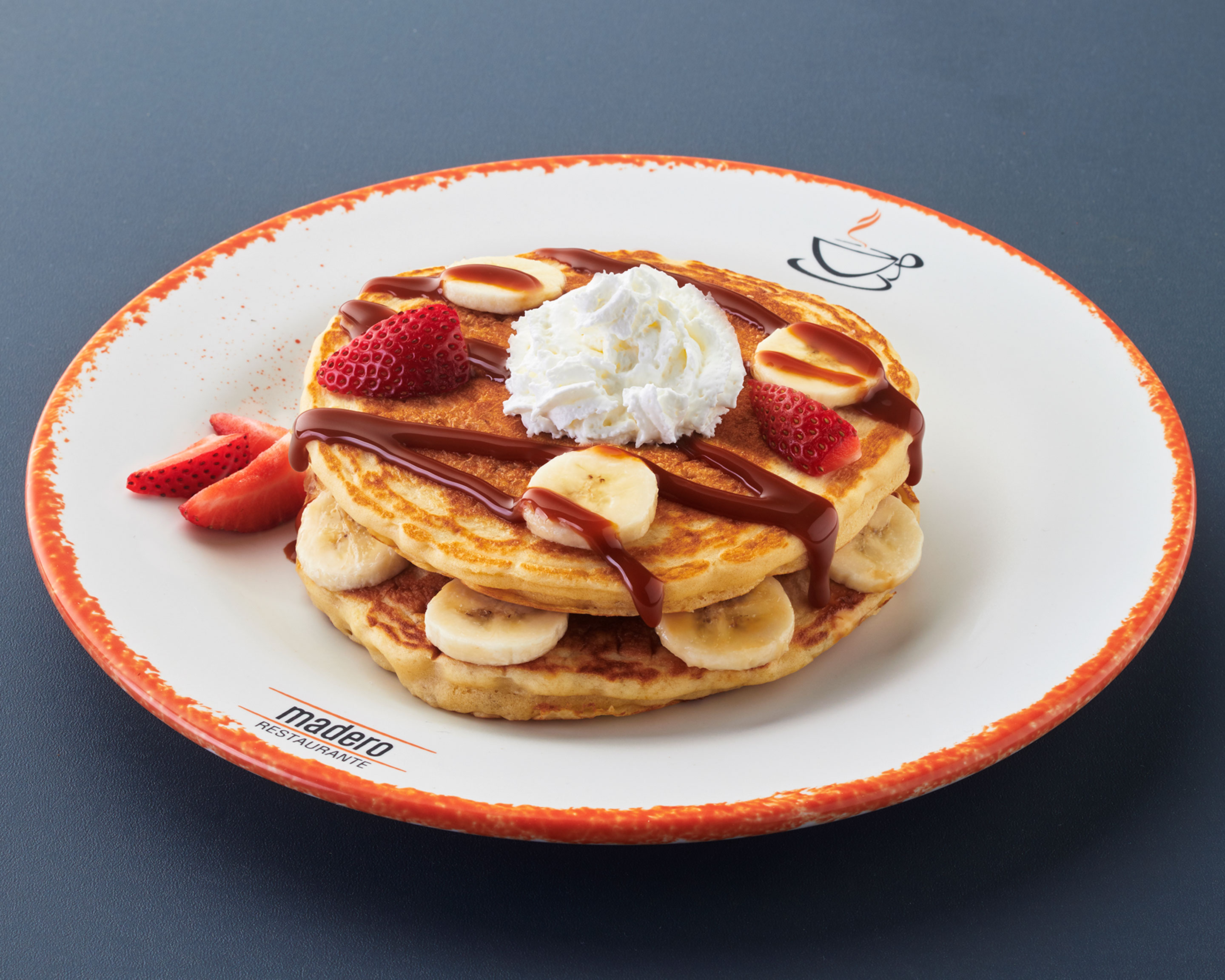 2 Piezas de hot cakes (a base de una mezcla de plátano con cajeta), fresa, plátano y crema chantilly.