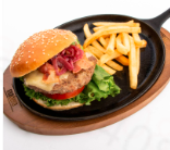 Hamburguesa con carne de res, queso manchego, tocino, mayonesa, lechuga, jitomate, cebolla caramelizada y nuestro pan de la casa. Elige una sola guarnición.