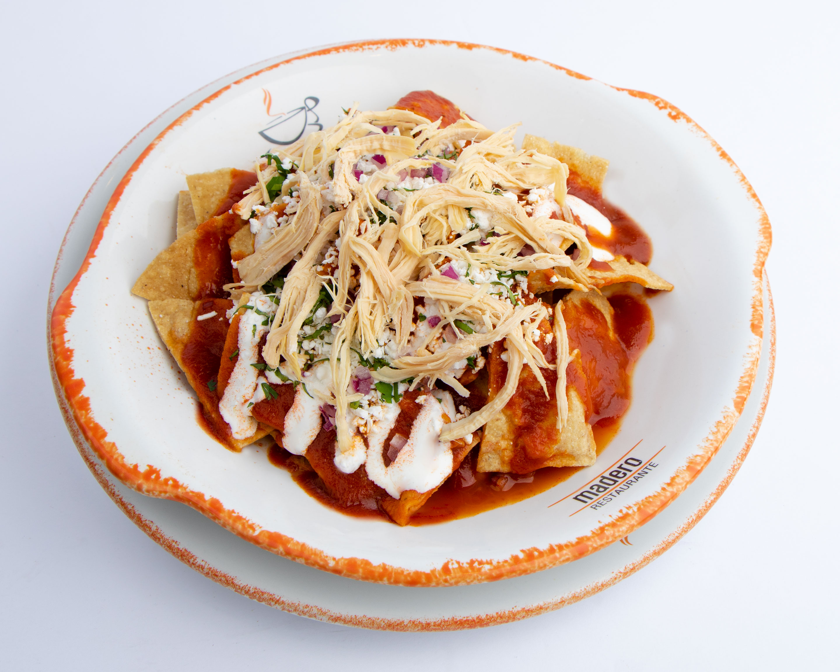Totopos de maíz fritos, bañados con salsa a elección con 60 g. de pechuga de pollo deshebrada, crema, cebolla morada, cilantro y queso canasto.