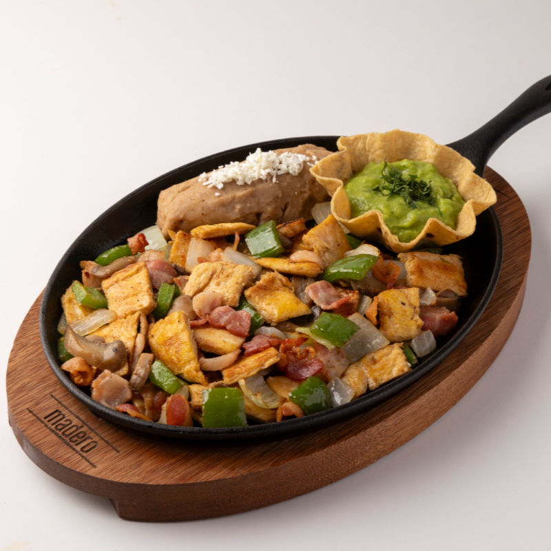 140 g. de filete de pechuga de pollo con 40 g. de tocino, pimiento morrón, cebolla y champiñones. Acompañado de frijoles refritos con queso canasto y guacamole.