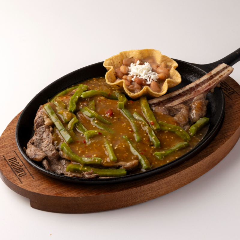 200 g. de costilla de res bañada en salsa morita con nopales acompañado con frijoles de la olla con queso canasto.