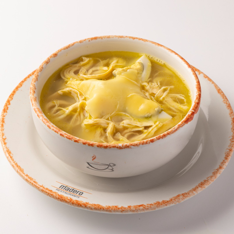 240 ml. de consomé de pollo con 20 g. de pechuga de pollo deshebrado, 1 pza. de huevo cocido y 20 g. de queso manchego. Acompañado de cebolla, cilantro, jitomate y chile serrano.