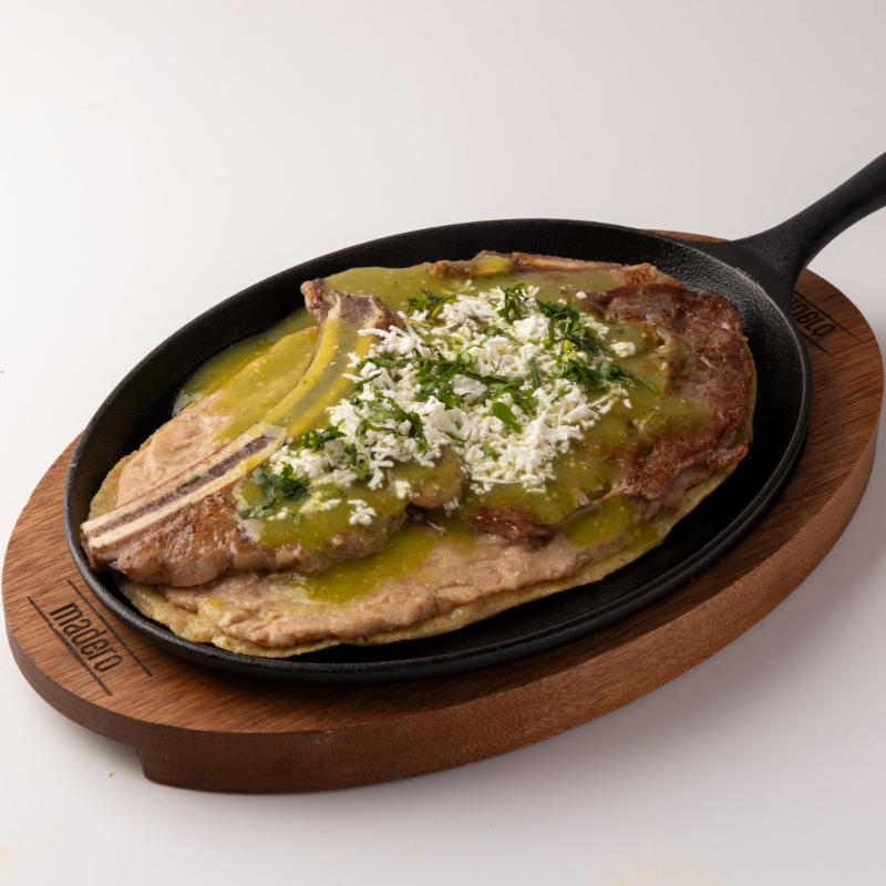 200 g. de bistec de res cubierto con frijoles refritos y gratinado con 40 g. de queso manchego. Acompañada de papas al perejil y guacamole.
