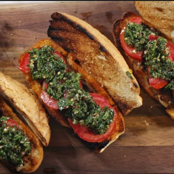 Preparada en crujiente pan con chimichurri, lechuga y jitomate.