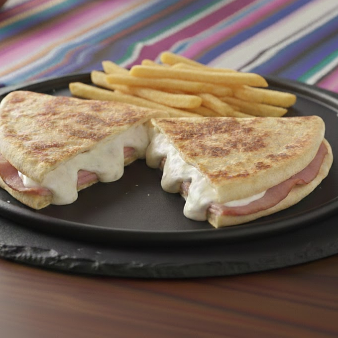 TORTILLA DE HARINA, JAMON, QUESO, UN POCO DE PAPAS A LA FRANCESA