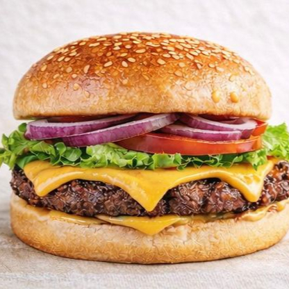 pan, carne de res, queso americano, lechuga, jitomate, cebolla
