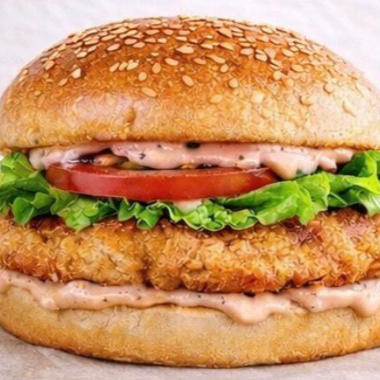 Pechuga de pollo empanizada, lechuga, jitomate y aderezo.