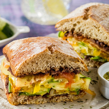 Pan artesanal tipo chapata, con queso oaxaca, jamón, queso manchego, jitomate, lechuga, cebolla, mayonesa y chorizo argenino