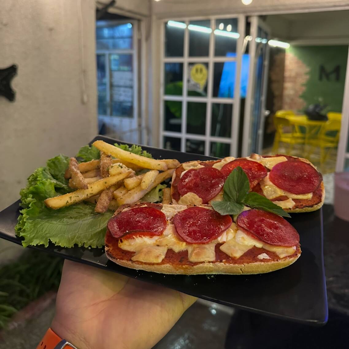 Pan artesanal de chapara con salsa para pizza, queso manchego, oaxaca y peperoni. Horneados