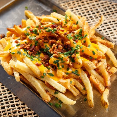 250g de papas a la francesa con carne tipo bolognesa 110 g , queso amarillo y queso parmesano